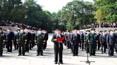 9月17日上午,第九批在韓中國人民志愿軍烈士遺骸安葬儀式,在沈陽抗美援朝烈士陵園舉行,退役軍人事務部黨組書記、部長裴金佳出席儀式并致祭文。